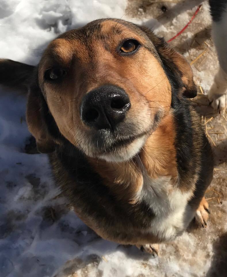 Having the longer snout of the chow and the ears of the australian shepherd.